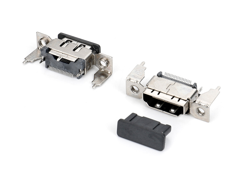 HDMI 19PIN A母直立式SMT型加支架高5.8mm带脚,端子半金1U雾锡,LCP黑色
