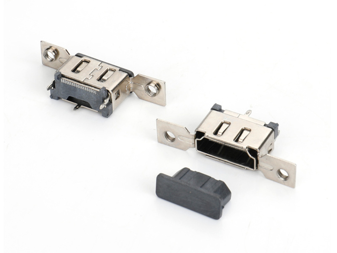 HDMI 19PIN A母直立式SMT型加支架高高8.4mm无脚,端子半金雾锡GF,LCP黑色