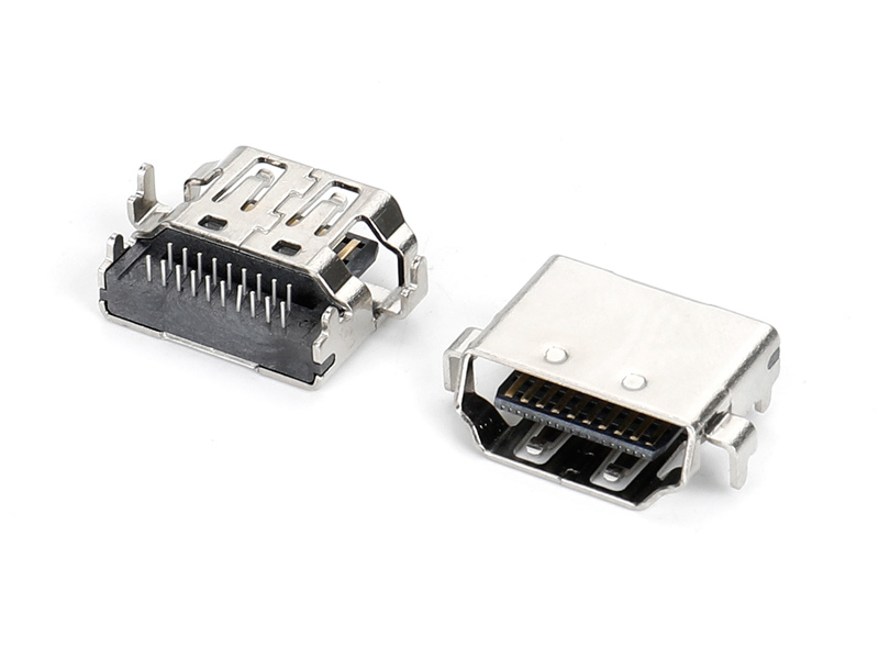 HDMI正向沉板铜壳镀镍窗口斜口两K脚两直脚,壳面模印,中心高度0.83 外壳总长12.05 端子间距1.5 半金雾锡1u